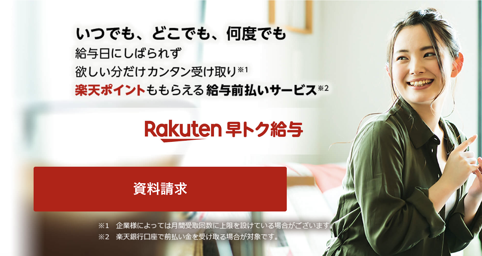 楽天早トク給与では従業員が働いた給料を給料日前日に受け取れる給料前払いサービスです。いつでもどこでも自分の好きなタイミングで給与を受け取る事ができるので急な出費にも対応する事ができます。